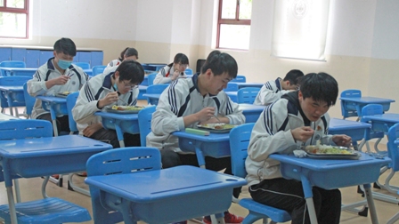 返校学习的第一天,初、高三学生一到校门口就在志愿者老师的引导下有序进入校园。午餐时间,学校启动临时就餐教室,确保一人一座,有足够的用餐空间。学生们在老师的指导下,间隔1米领取餐盒,井然有序地就餐。
