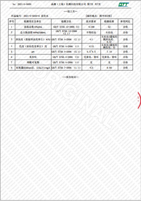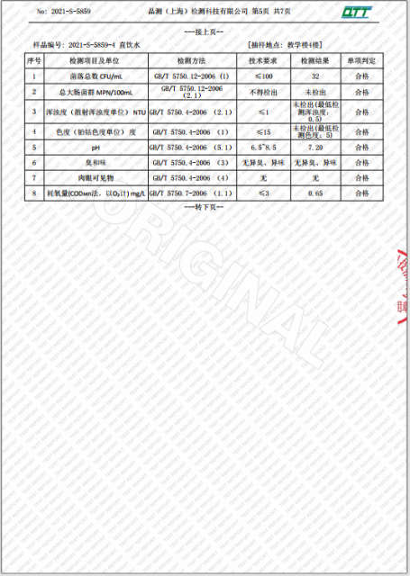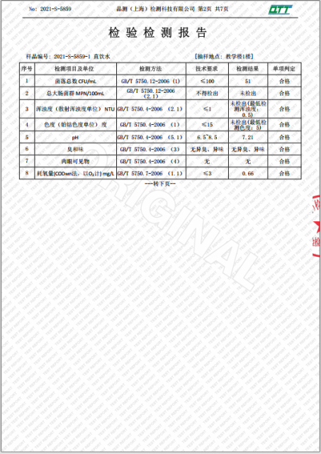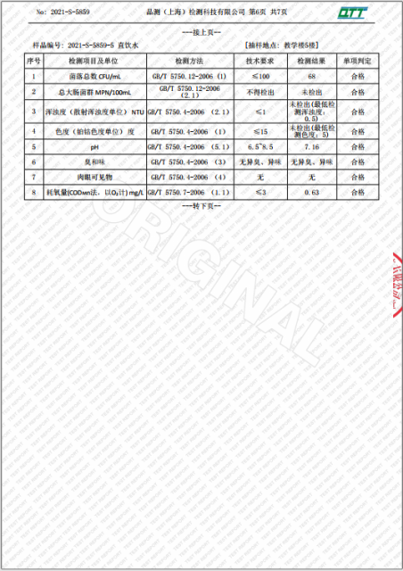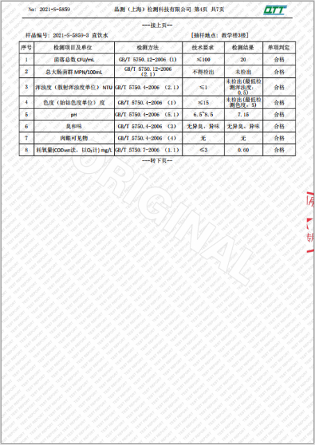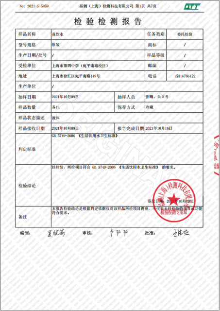 上海市第四中学十月水质检测报告(宛平南路校区)