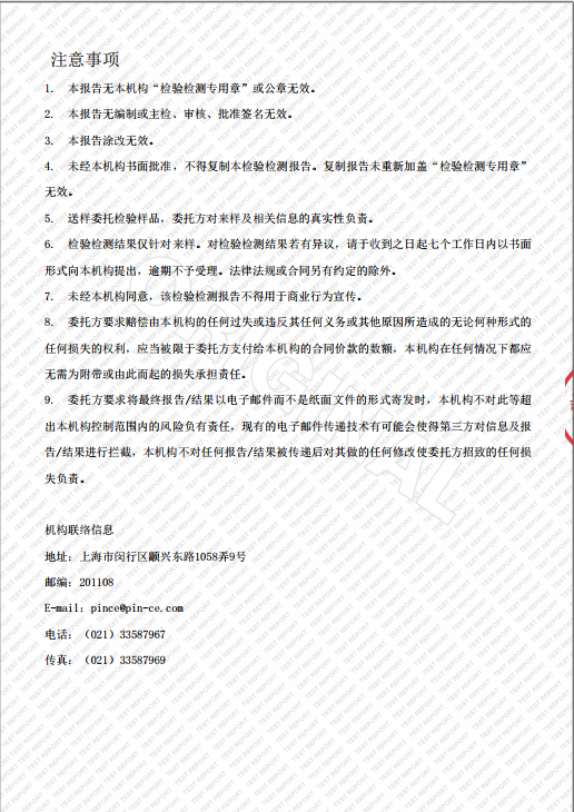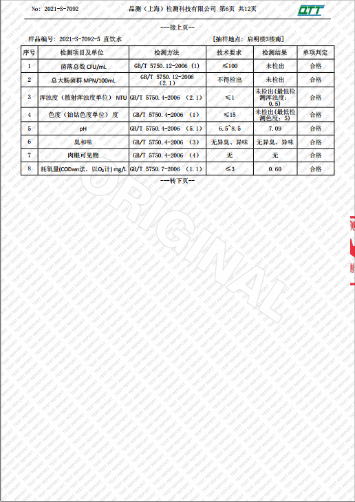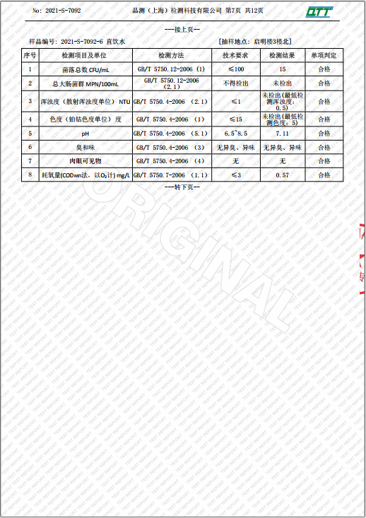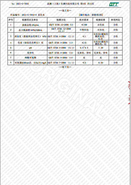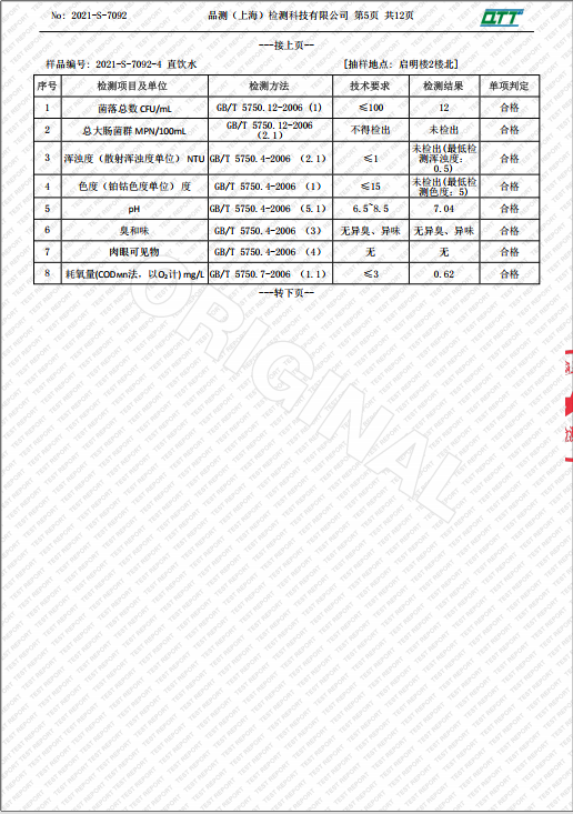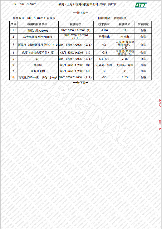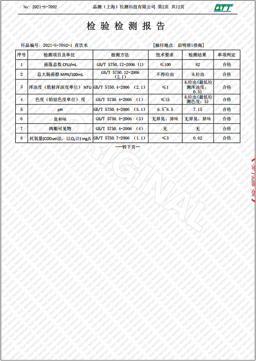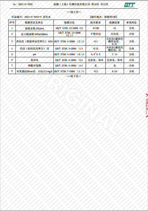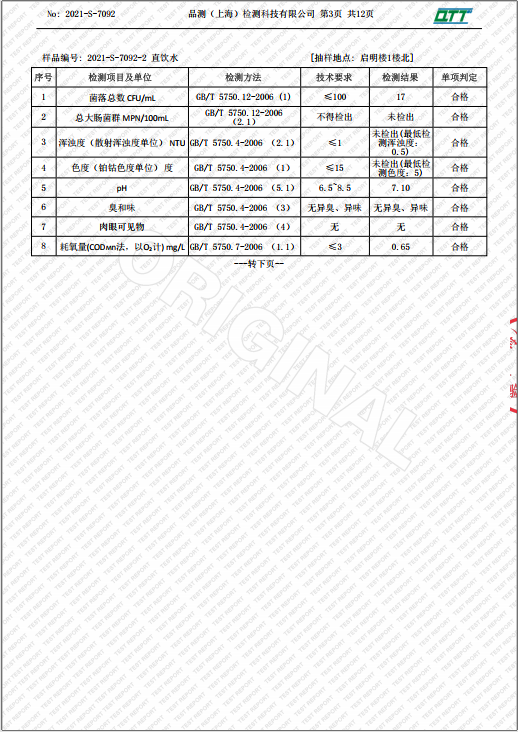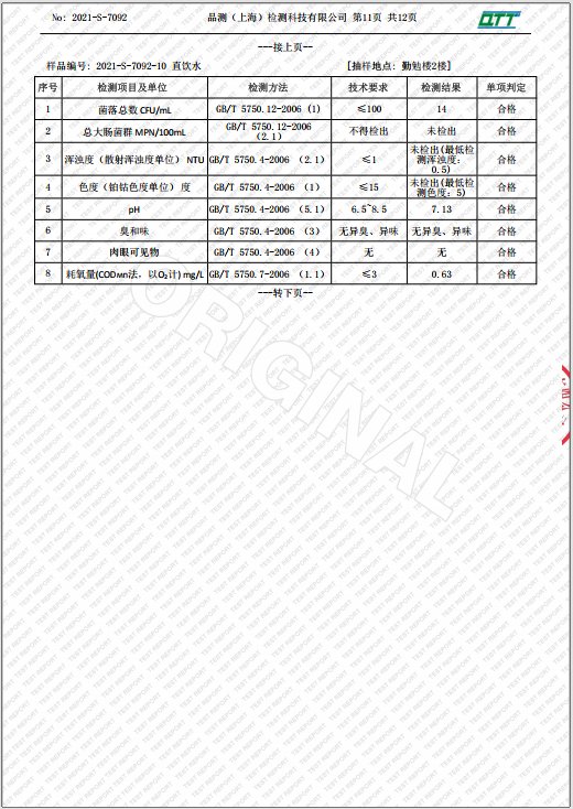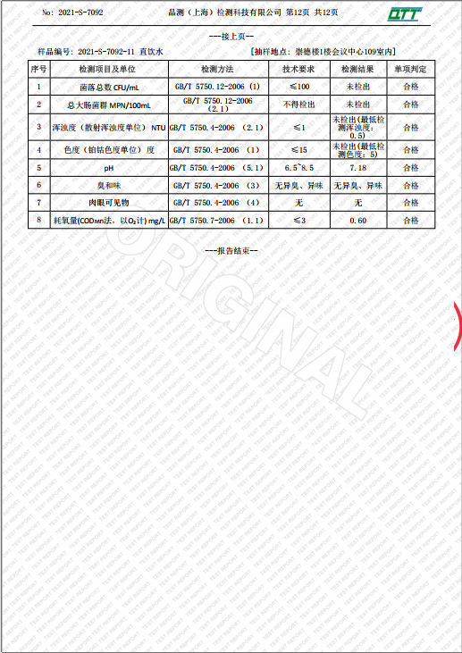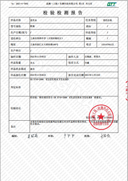 上海市第四中学十一月水质检测报告(天钥桥路校区)