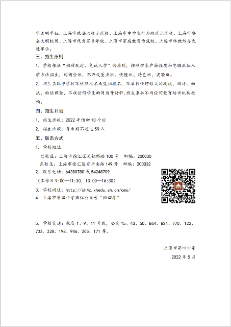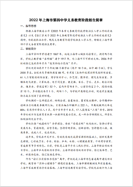 2022年上海市第四中学义务教育阶段招生简章