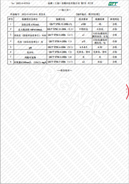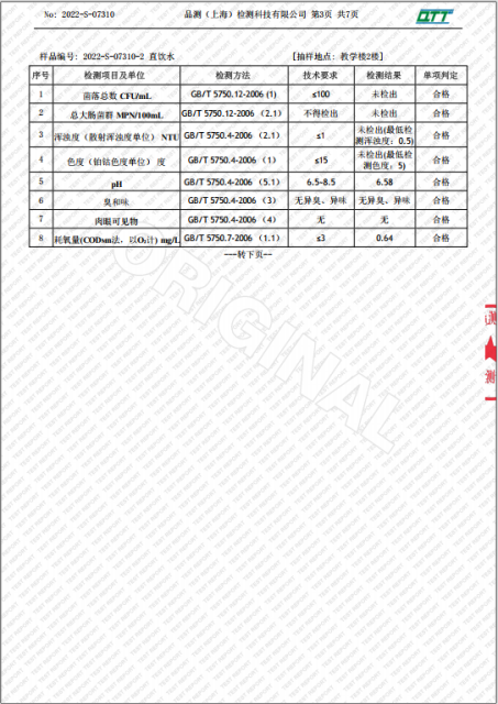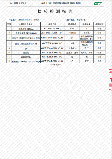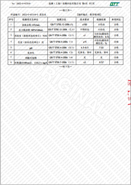 上海市第四中学七月水质检测报告(宛平南路校区)