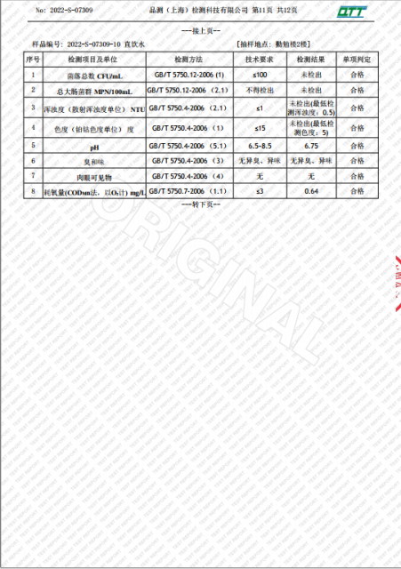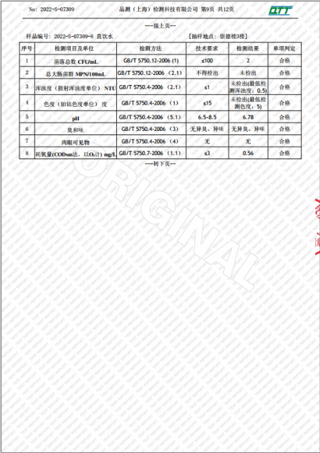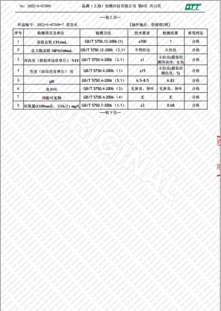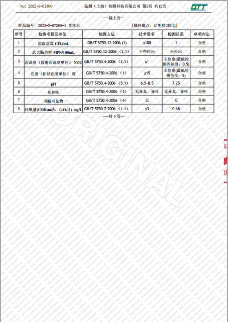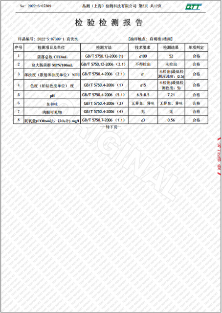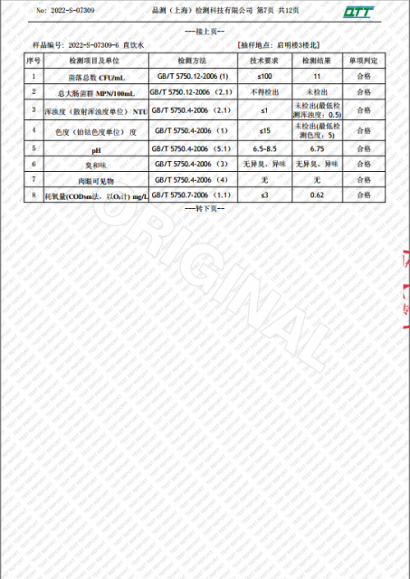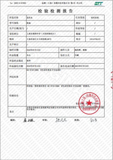 上海市第四中学七月水质检测报告(天钥桥路校区)