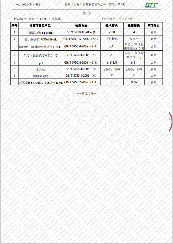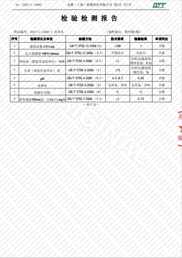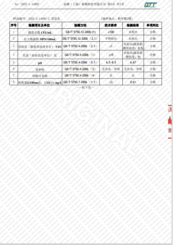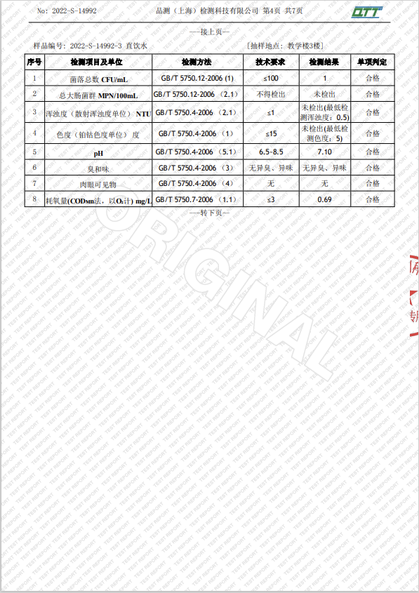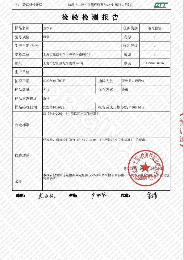 上海市第四中学十月水质检测报告(宛平南路校区)