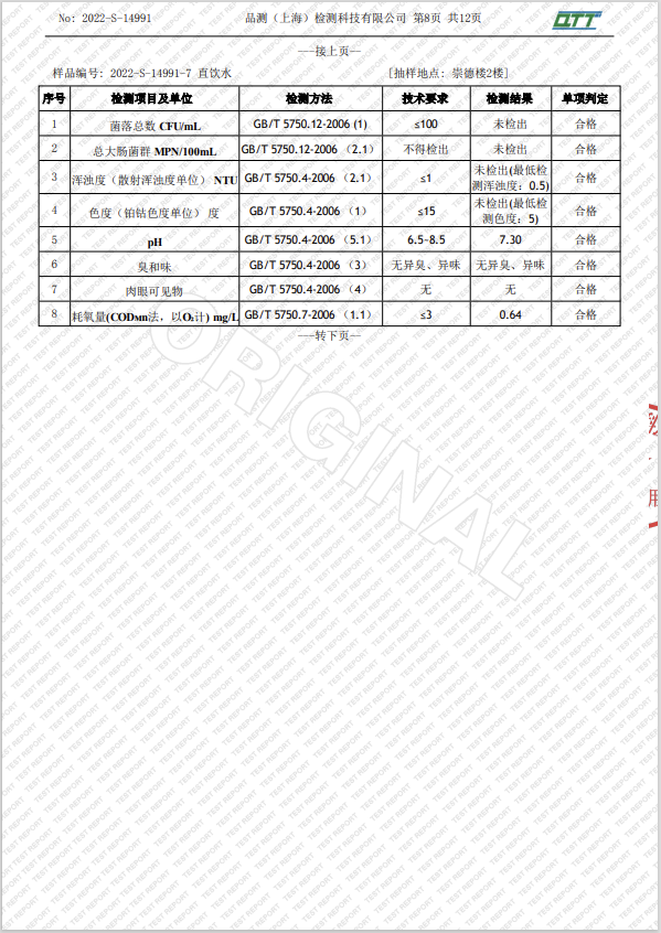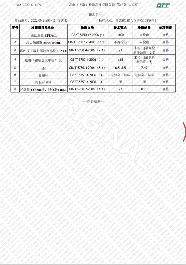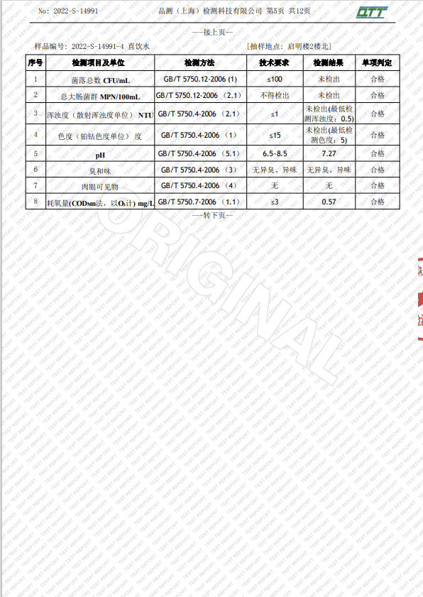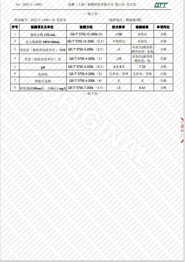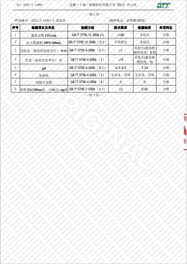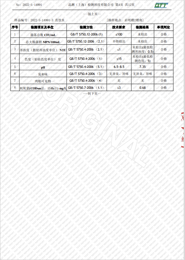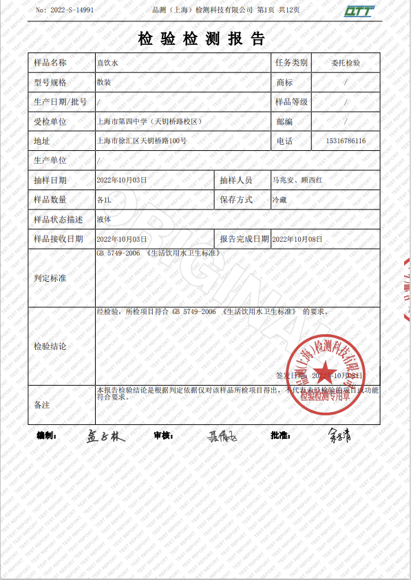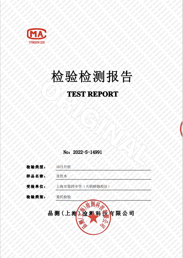 上海市第四中学十月水质检测报告(天钥桥路校区)