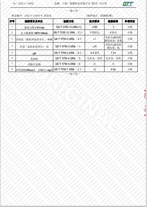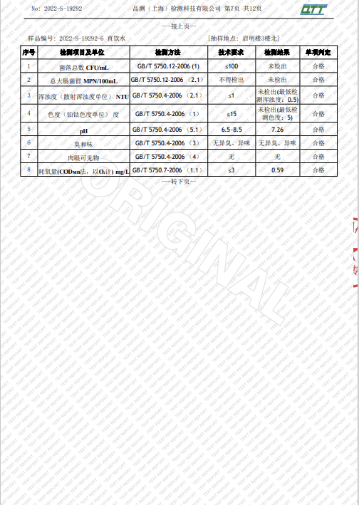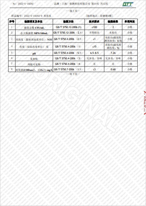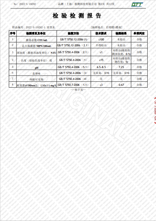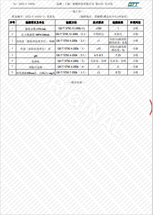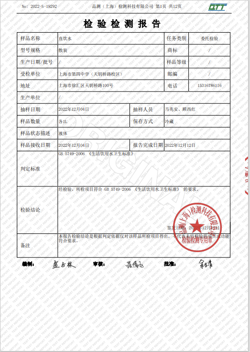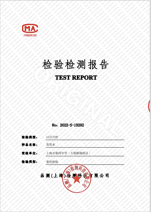 上海市第四中学十二月水质检测报告(天钥桥路校区)
