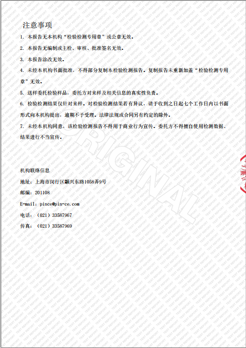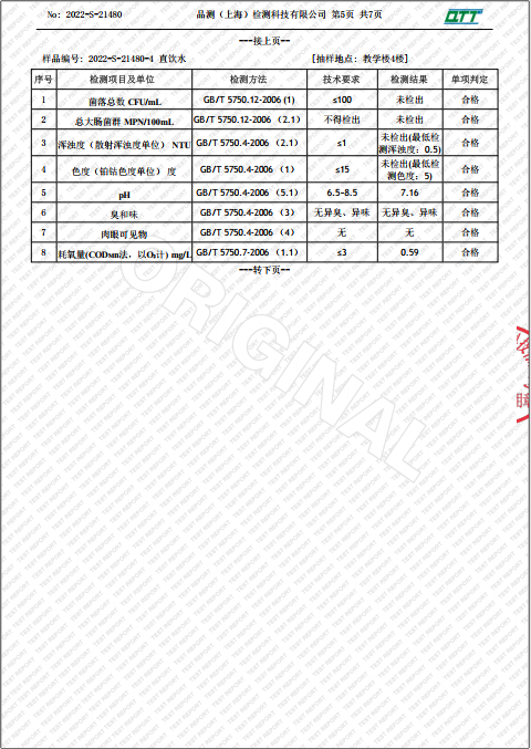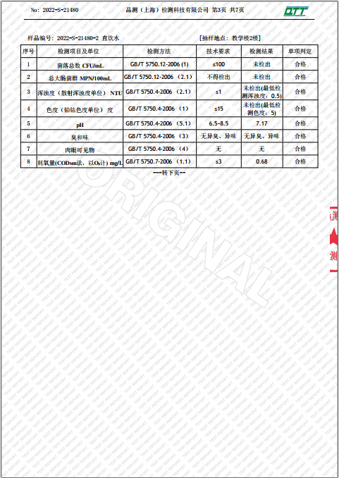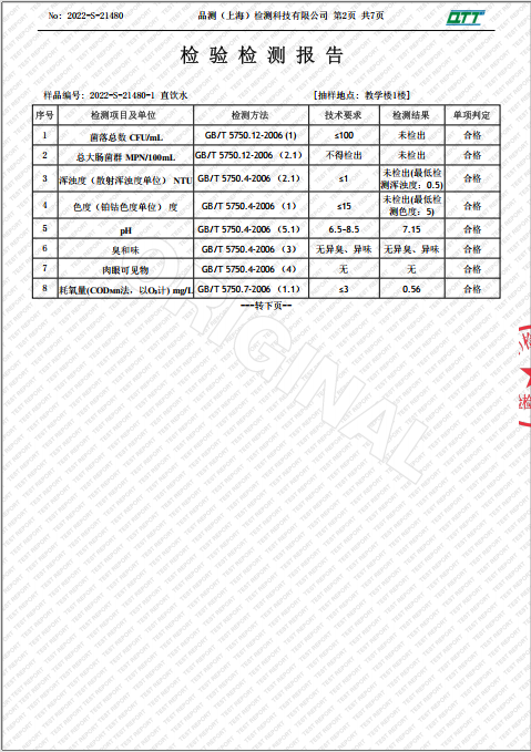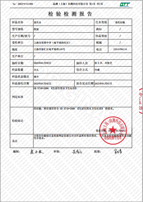 上海市第四中学一月水质检测报告(宛平南路校区)