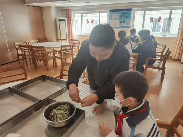 到达餐厅,厨师叔叔早已准备好了食材和器具。同学们将齐心协力,为老人准备今天的晚餐——上海馄饨。包院长得知大家从未有过包馄饨的经历,亲自做起了示范。一折、一捏的操作看起来简单,大家都跃跃欲试,包院长笑着说:“我教千遍也没用,你们不如自己做试试看。”于是,大家立刻动手包起了馄饨。正是在实践中,大家明白了院长话中的含义:刚开始同学们做出来的馄饨几乎都是奇形怪状的小面团,也会为加多了馅料没法成型而苦恼,但是大家毫不气馁,互相交流探讨,随着一次次尝试并积累经验,初见成型并小有模样。时间流逝,馄饨皮在不知不觉中被用光了,桌面上也粘满了面粉,而一开始的小面团,也演变成了一个个棱角分明的金元宝,装满了几大盆。