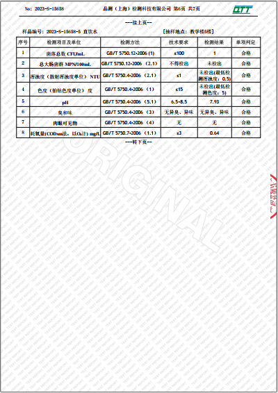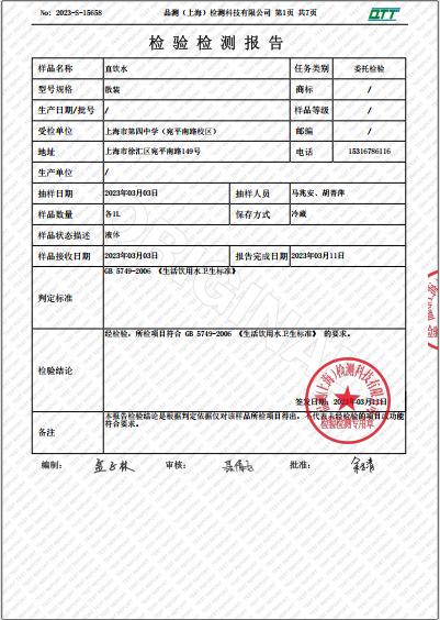 上海市第四中学三月水质检测报告(宛平南路校区)