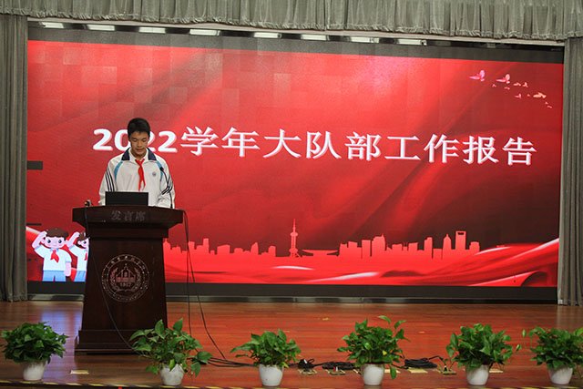 接着,上一届大队委员王泽文同学做2022学年少先队工作报告。在以文字讲述少先队的常规工作后,他以视频的形式,通过一个个精彩的画面,带领大家回顾了过去一学年,在校少工委的指导和校科技组、艺术组、体育组等老师们的带领下,四中初中部开展的丰富多彩的活动。