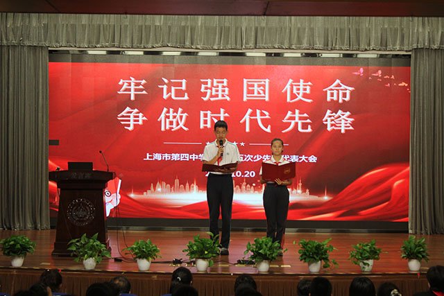 2023年10月20日下午,上海市第四中学第三十五次少先队代表大会正式会议在集美礼堂隆重举行。新一届校少工委委员和队员代表出席会议,全体少先队员通过直播观摩了本次盛会。