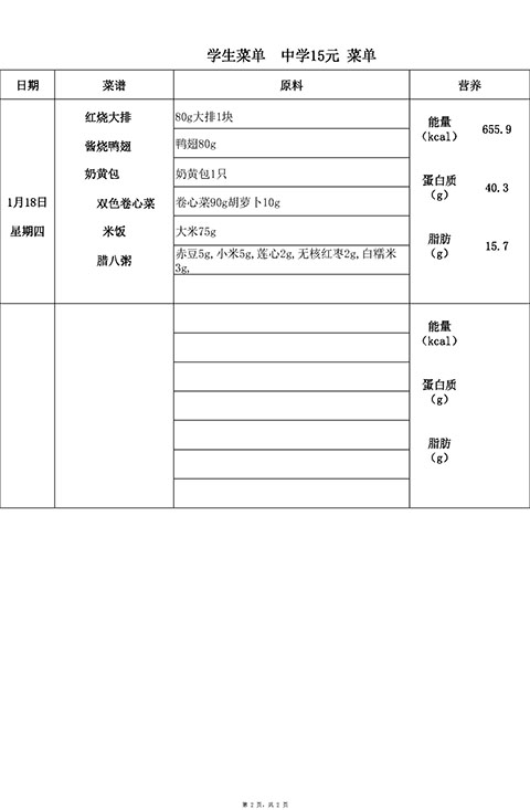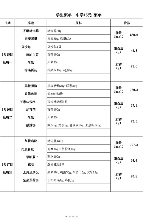 2024年1月15日-1月19日学生菜单