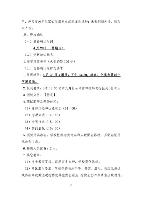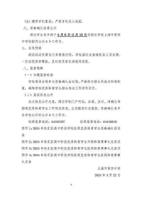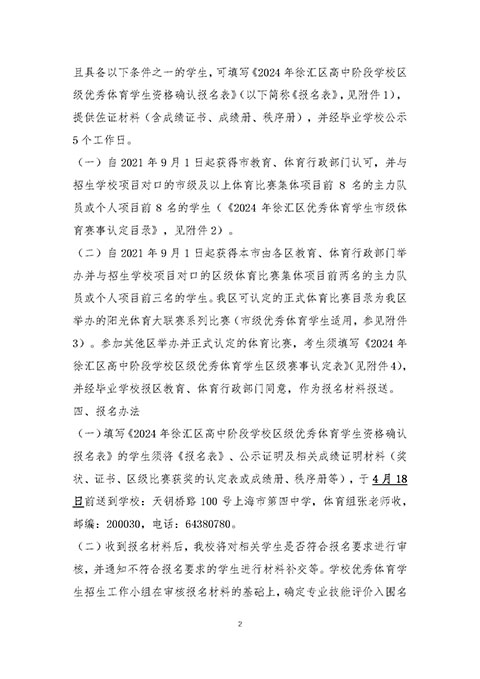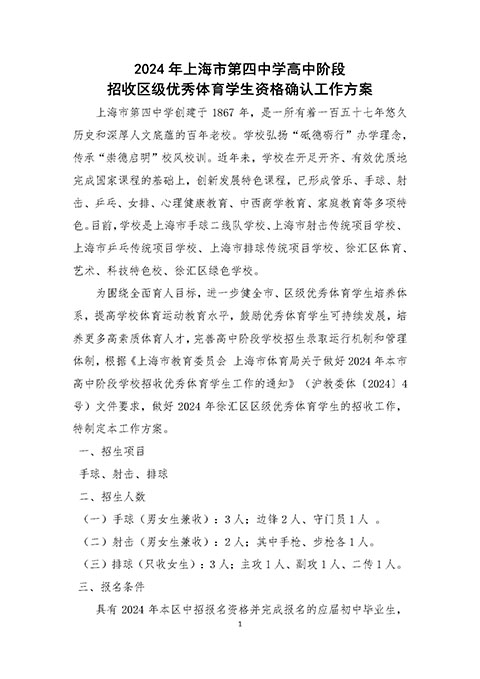 2024年上海市第四中学招收区级优秀体育学生资格确认工作方案