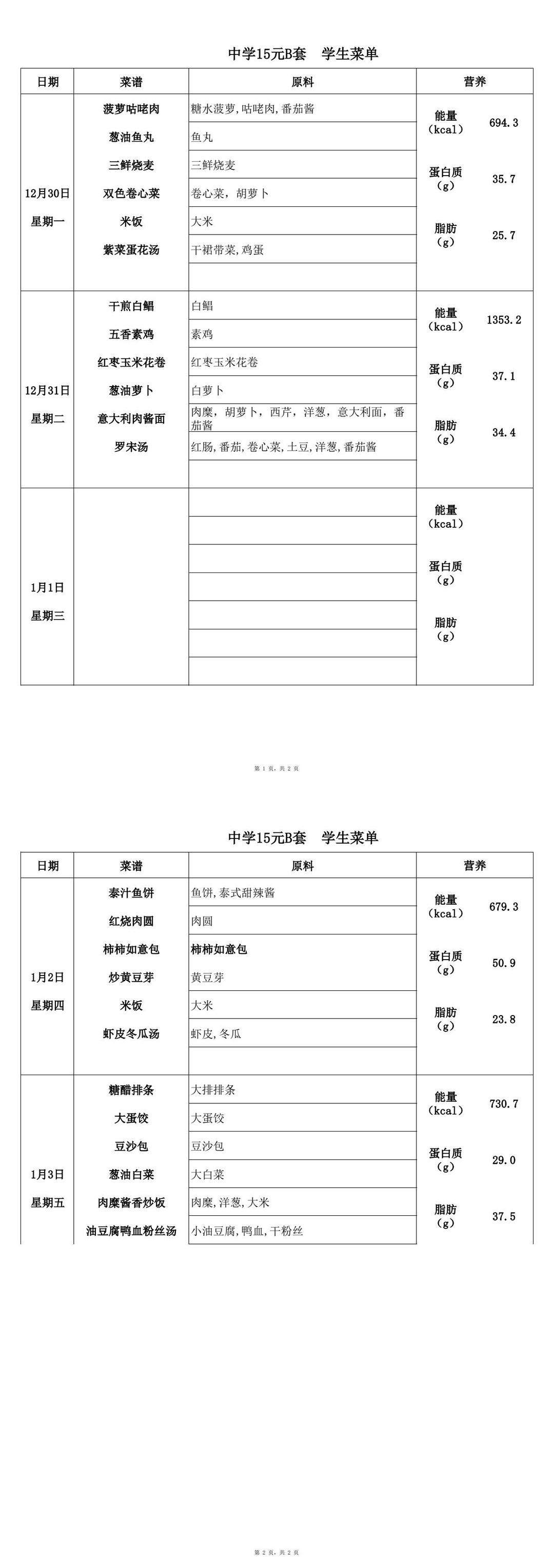 2024年12月30日-2025年1月3日学生菜单