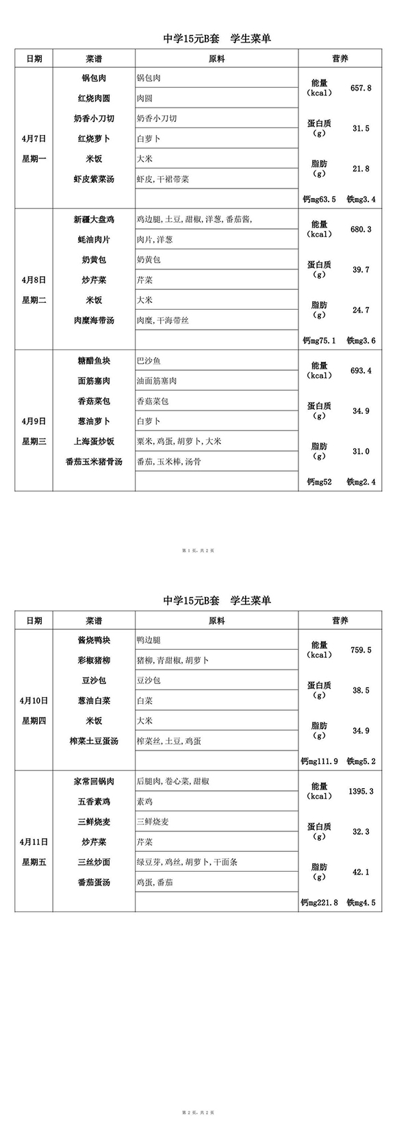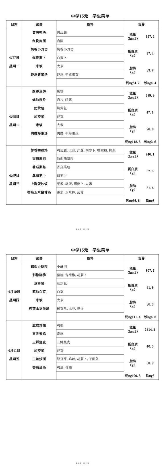 2025年4月7日-4月11日学生菜单