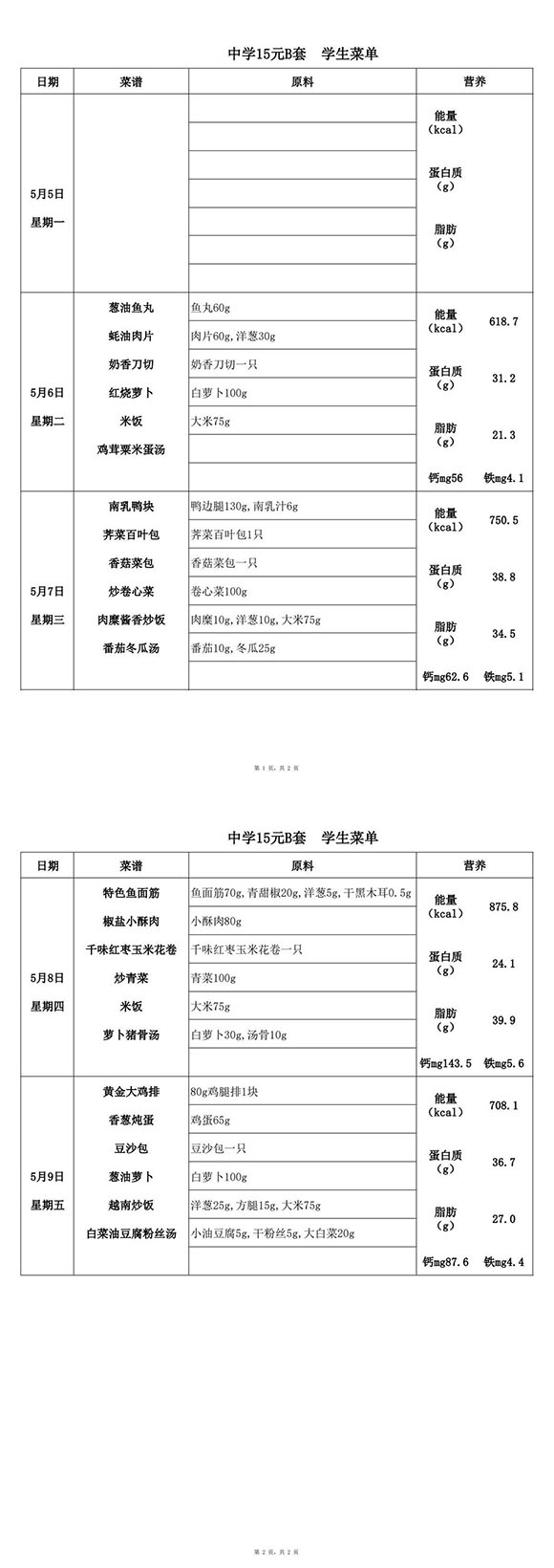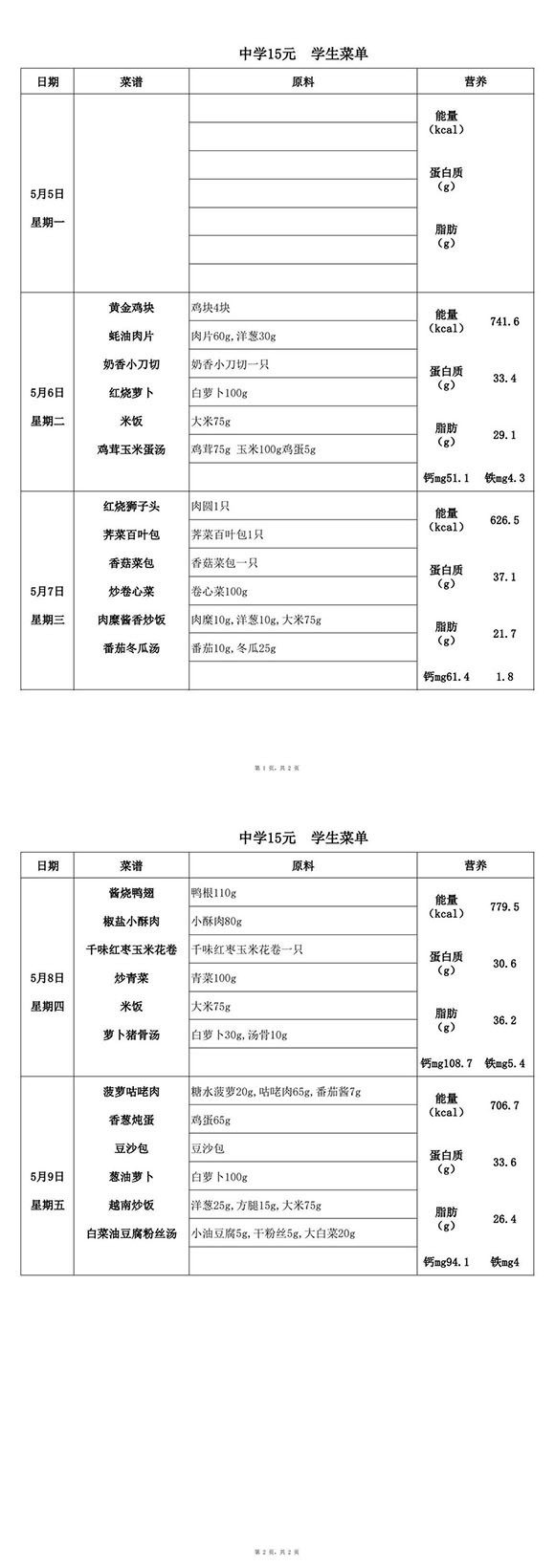 2025年5月6日-5月9日学生菜单