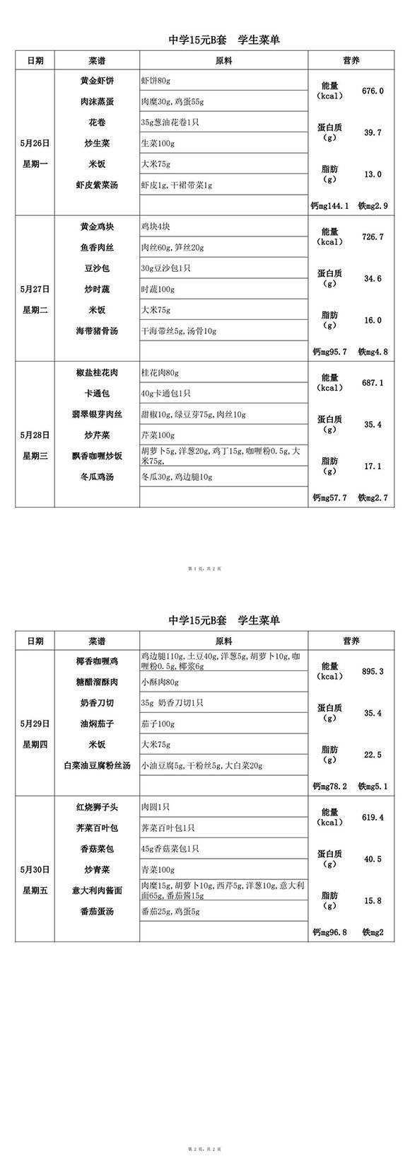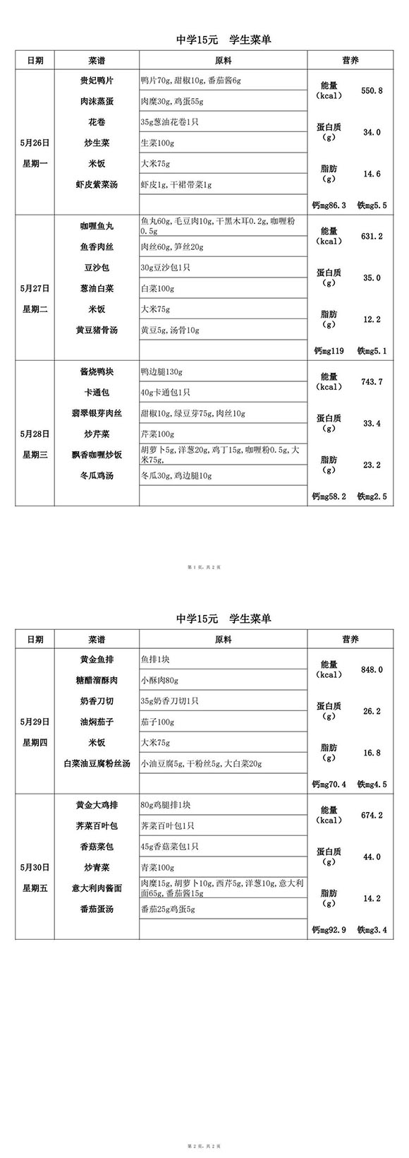 2025年5月26日-5月30日学生菜单